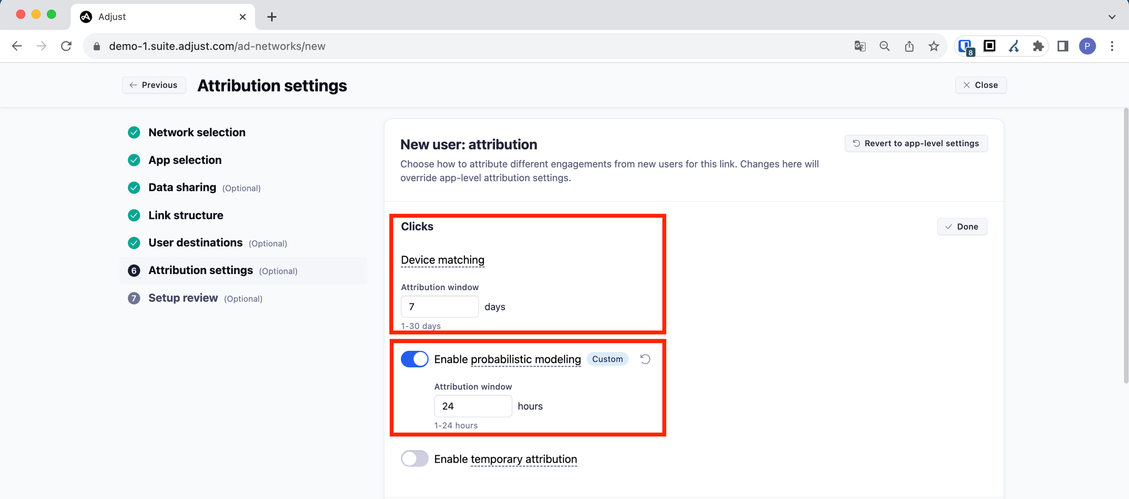 Please set the Attribution window in the probabilistic matching section to 24 HOURS.