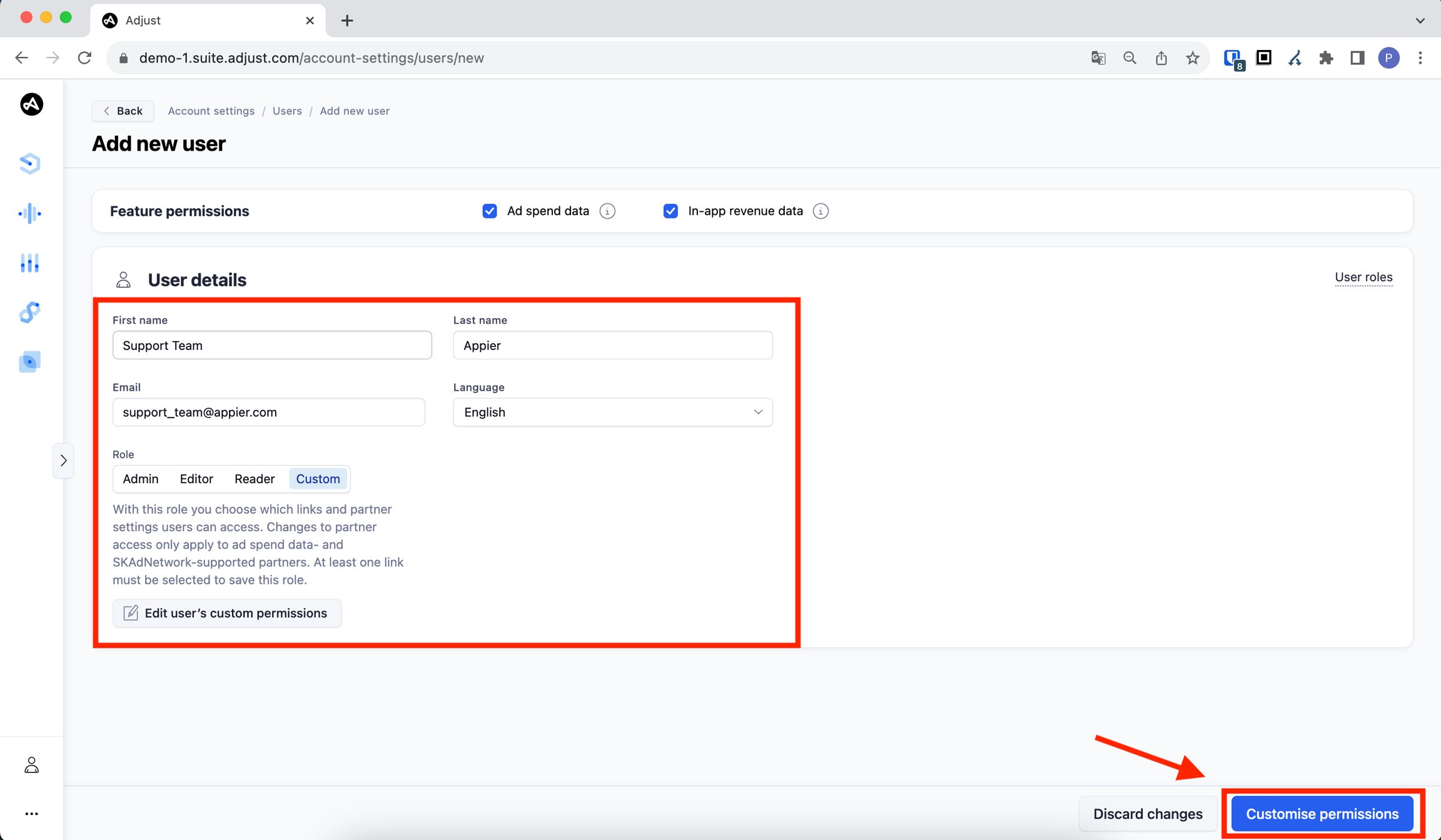 In the "First name" field, enter "Support Team," and in the "Last name" field, enter "Appier."