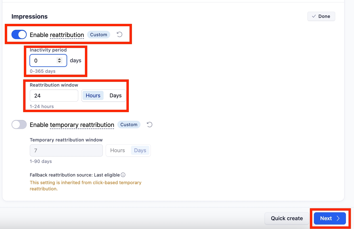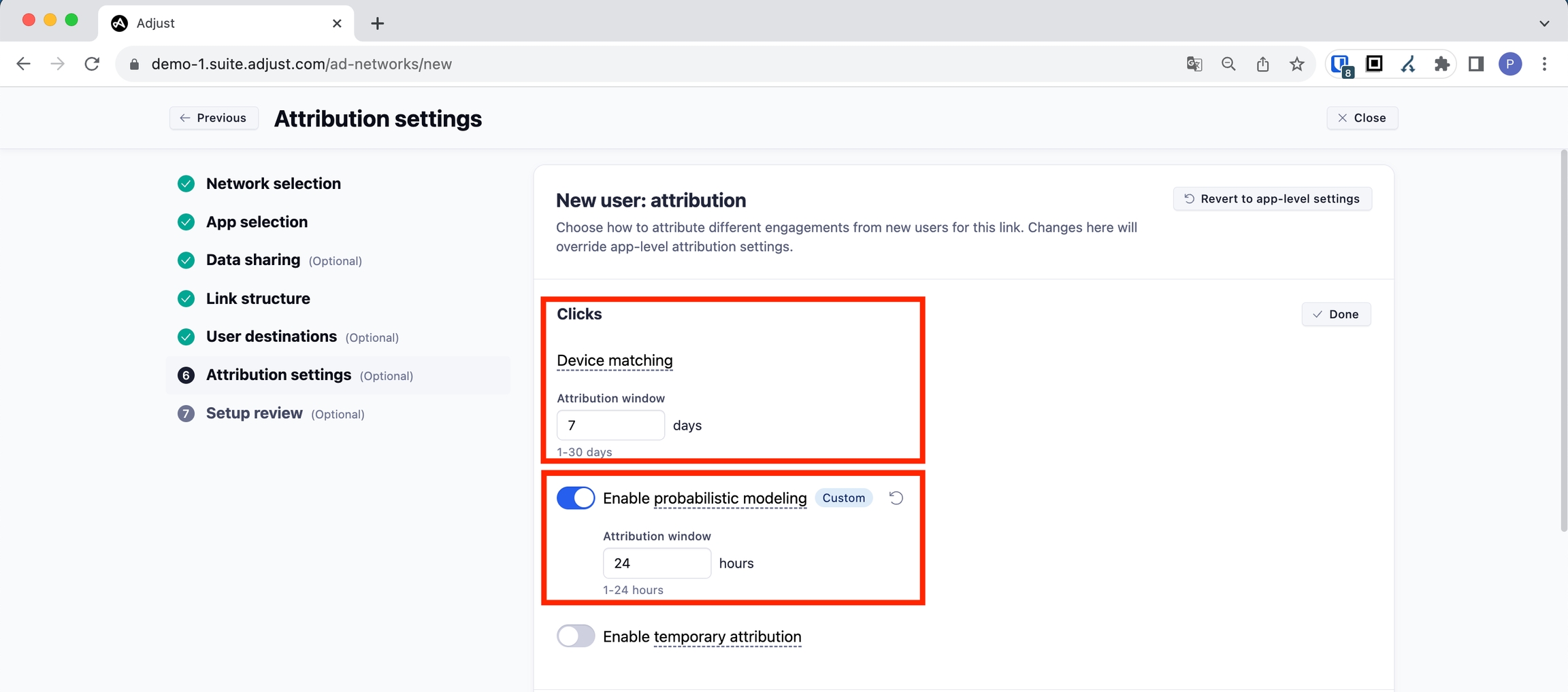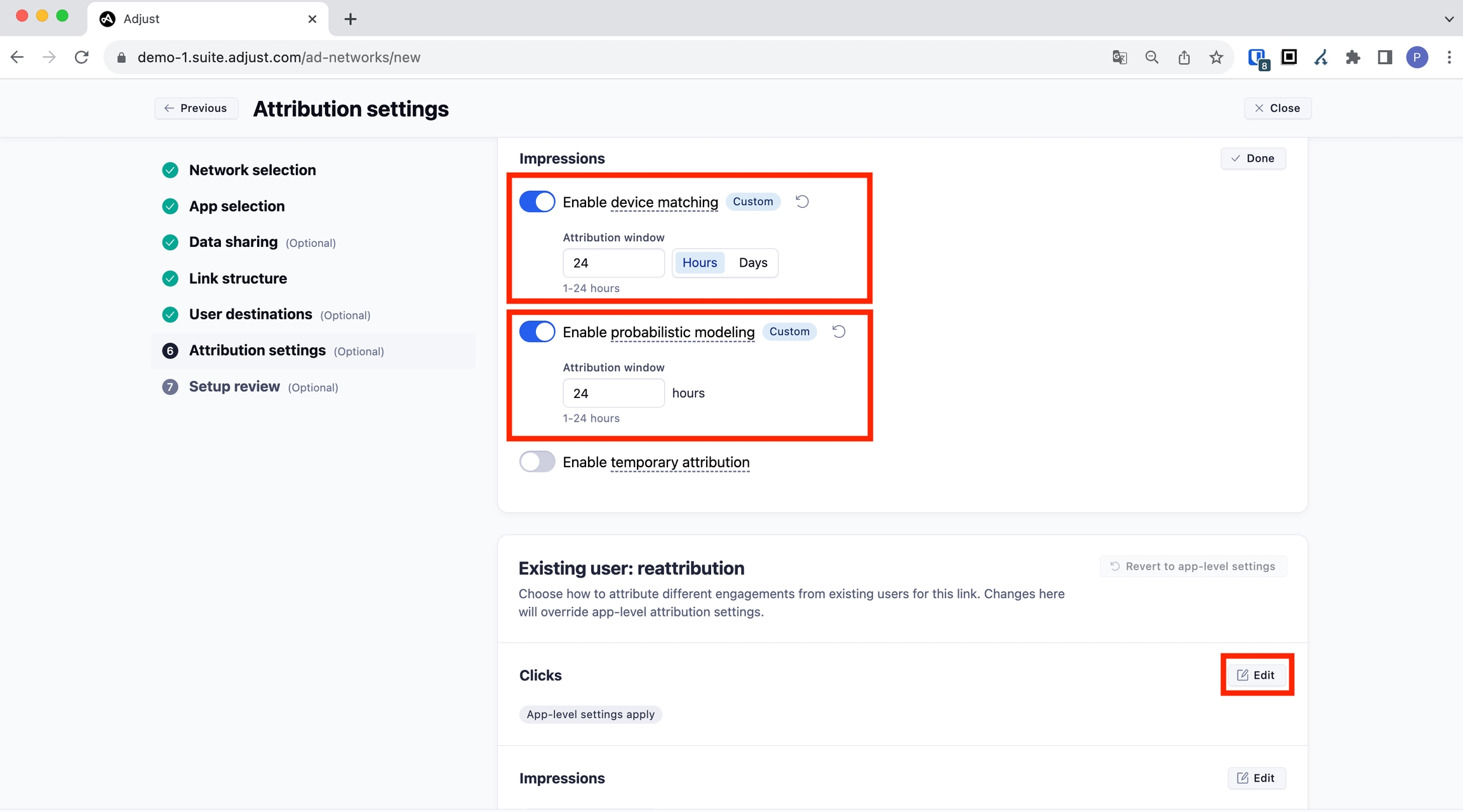 確率的マッチングセクションのアトリビューションウィンドウを 24 時間に設定してください。