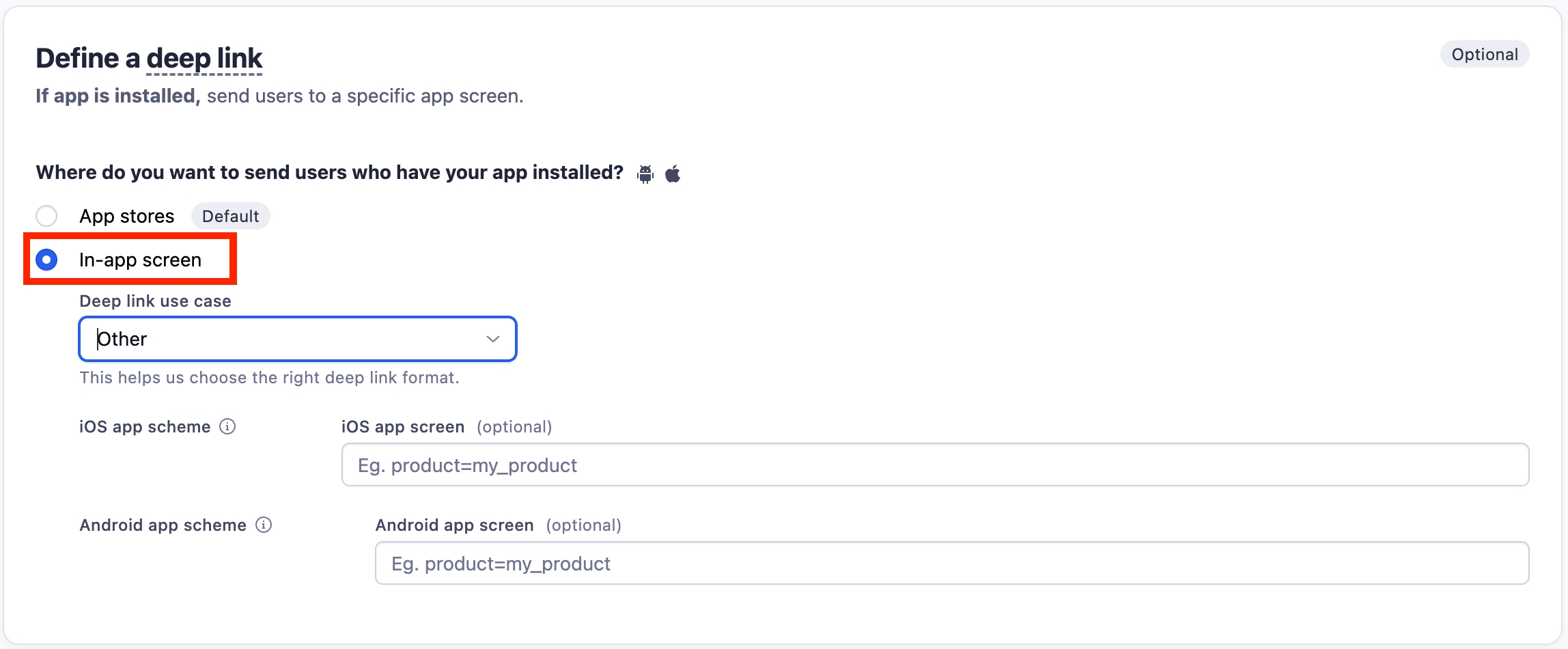 「ディープリンク」を「アプリストア(デフォルト)」から「アプリ内画面」に変更してください。