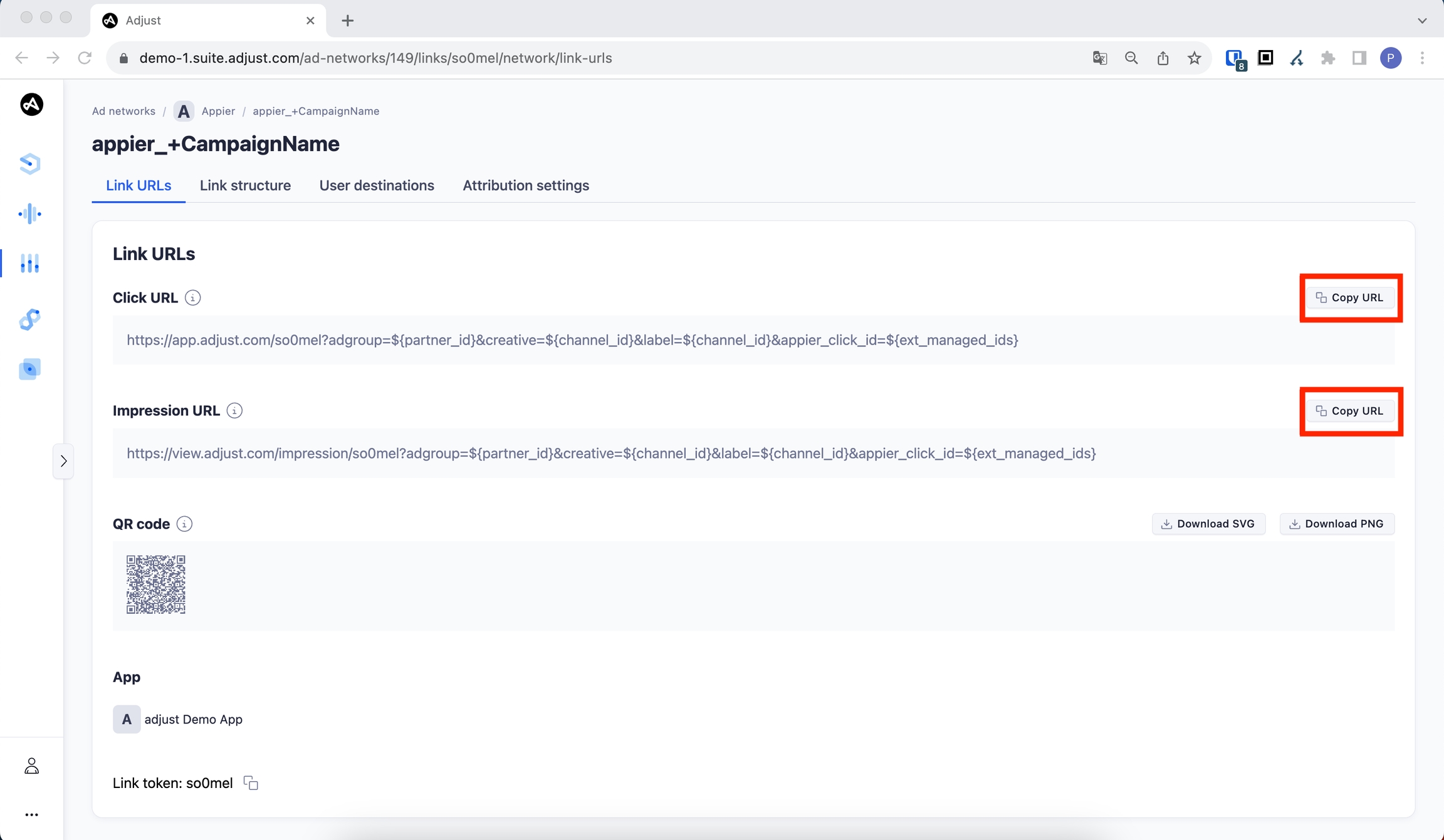 「URLをコピー」ボタンをクリックして、AppierのクリックURL/インプレッションURLをコピーします。