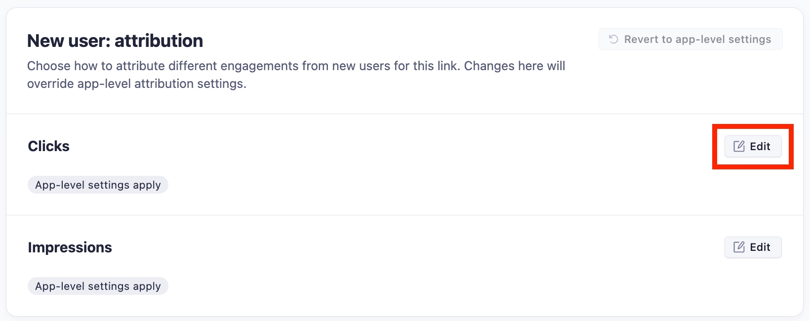 「新規ユーザー: アトリビューション」フィールドの「クリック数」セクションの右側にある「編集」ボタンをクリックしてください。