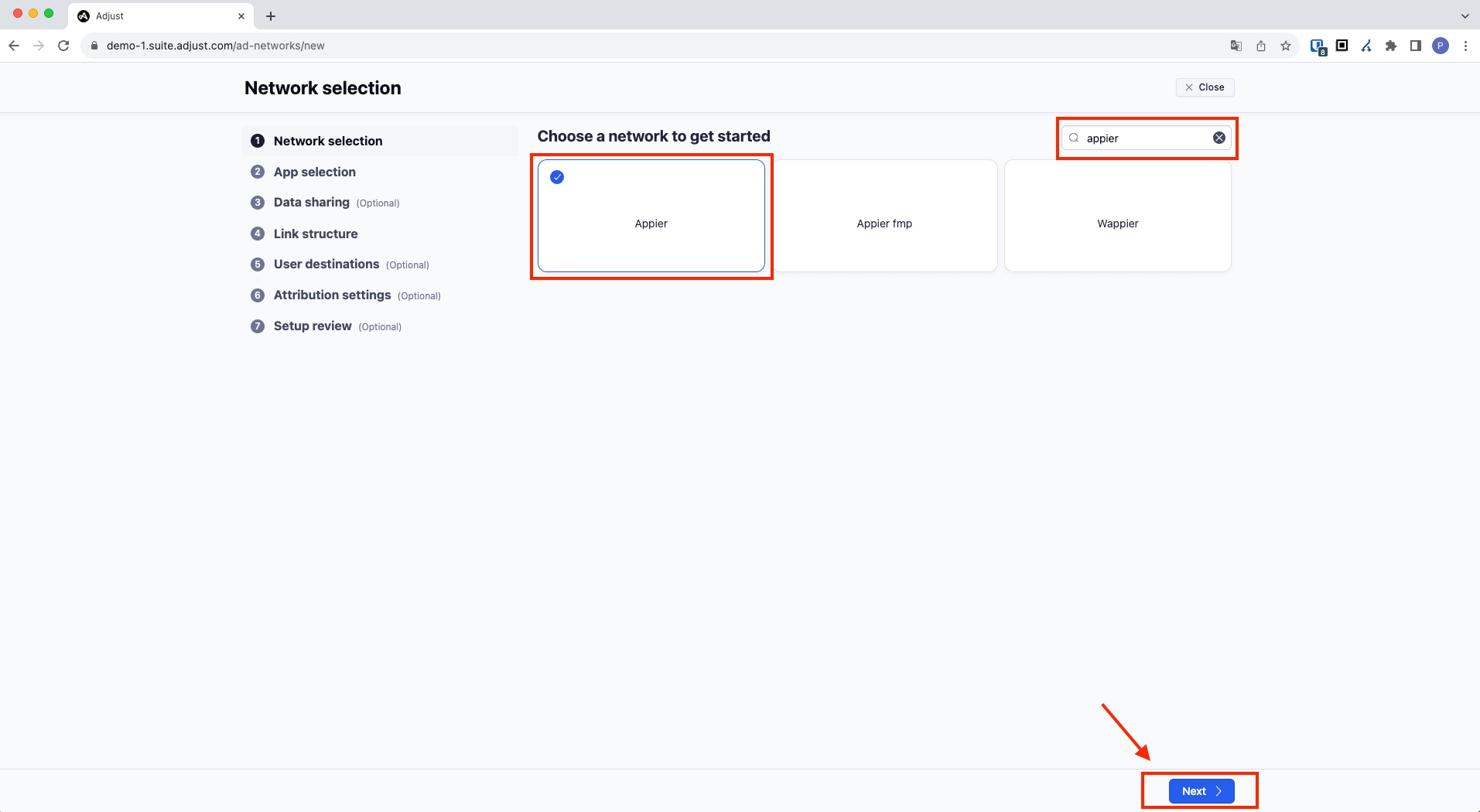 検索バーで「appier」を検索し、「Appier」を選択して右下の「次へ」ボタンを押します。