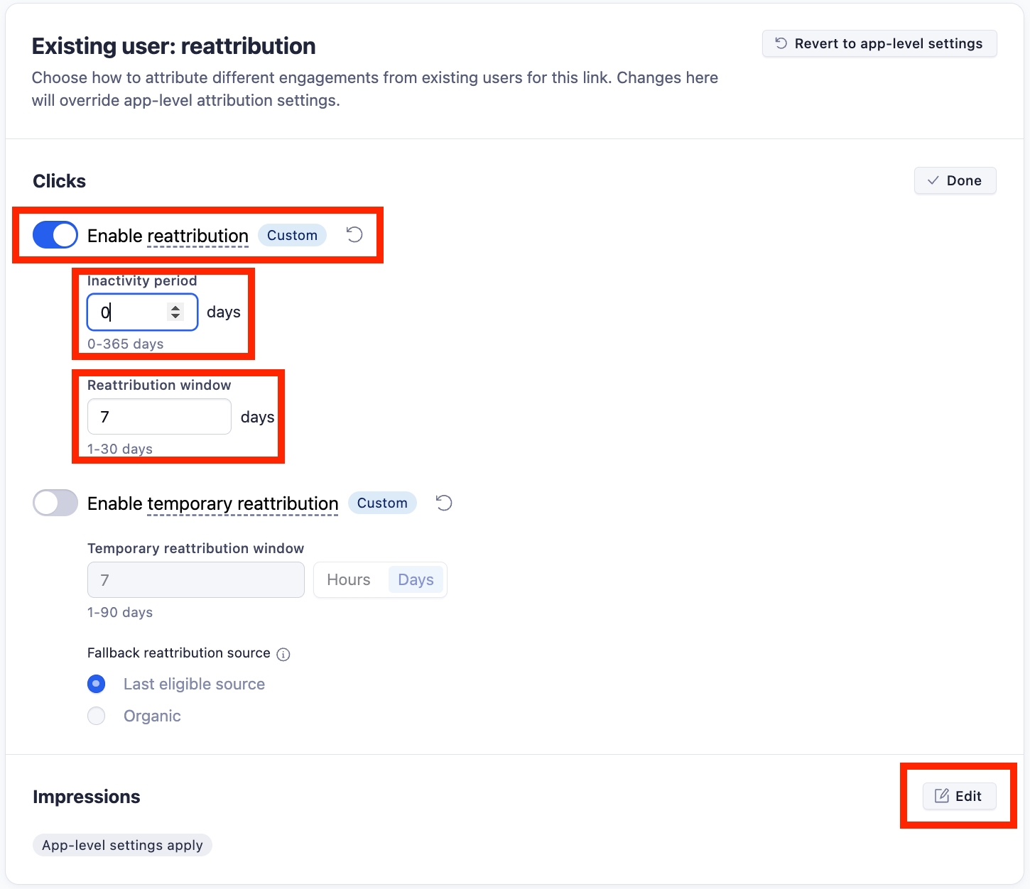 「既存ユーザー: リアトリビューション」フィールドの「クリック数」セクションの右側にある「編集」ボタンをクリックしてください。