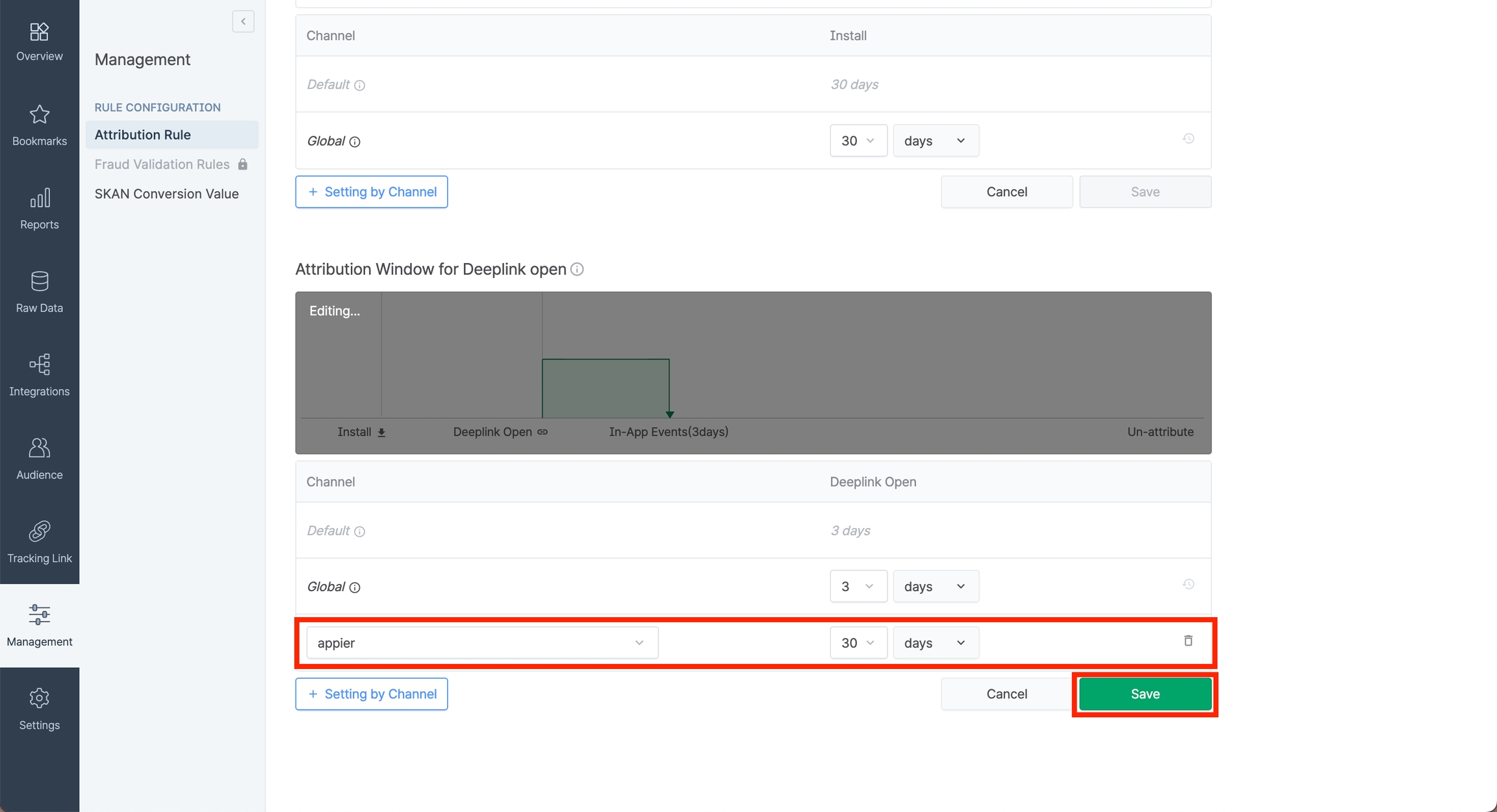 ディープリンクオープンセッションのアトリビューションウィンドウで「編集ウィンドウ」をクリックします。