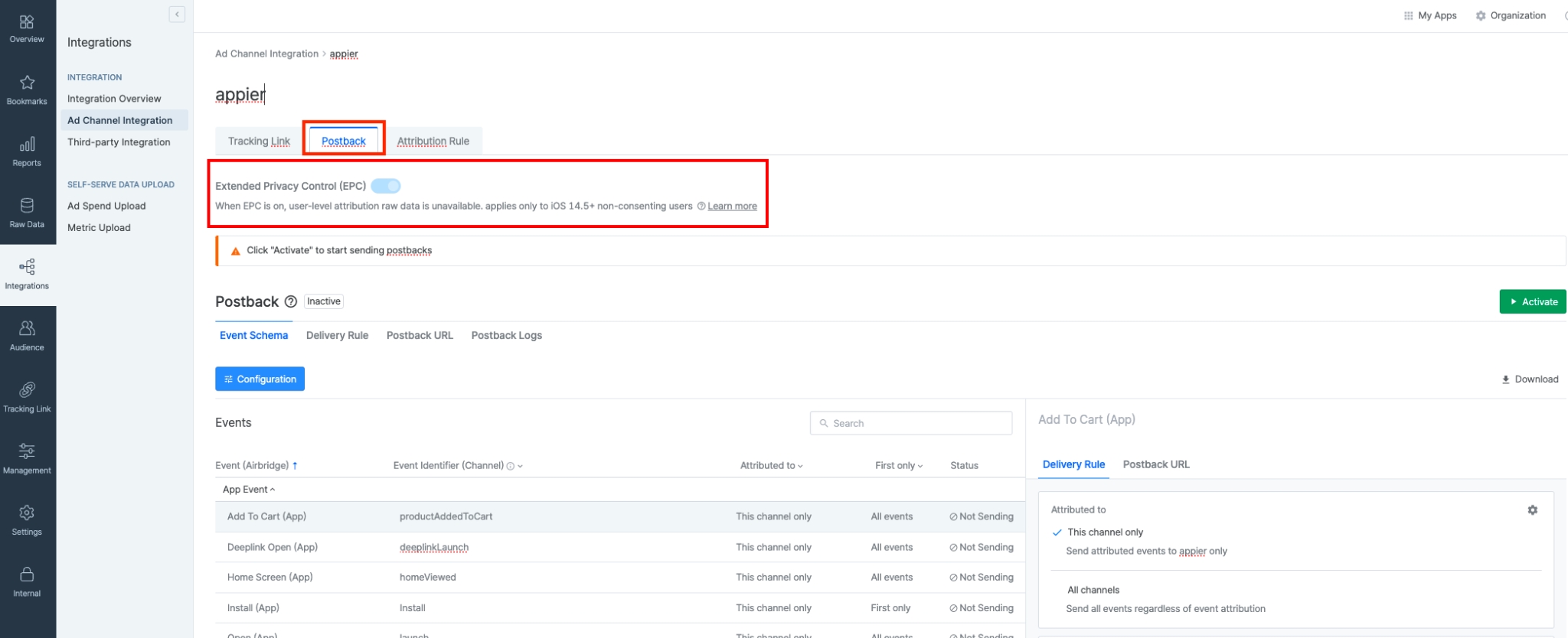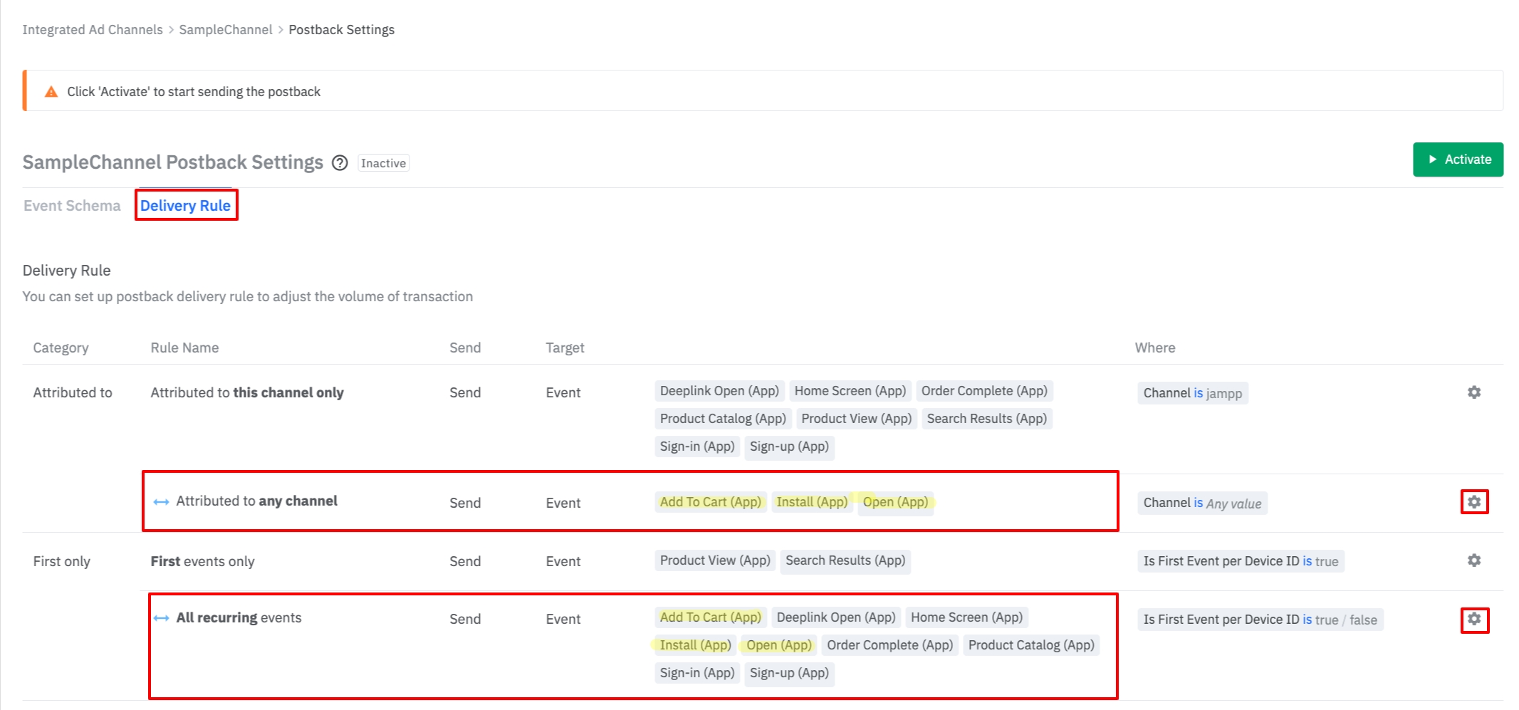 [統合] に移動 > 統合された広告チャネル > チャンネルを選択 > ポストバック設定 >配信ルール】