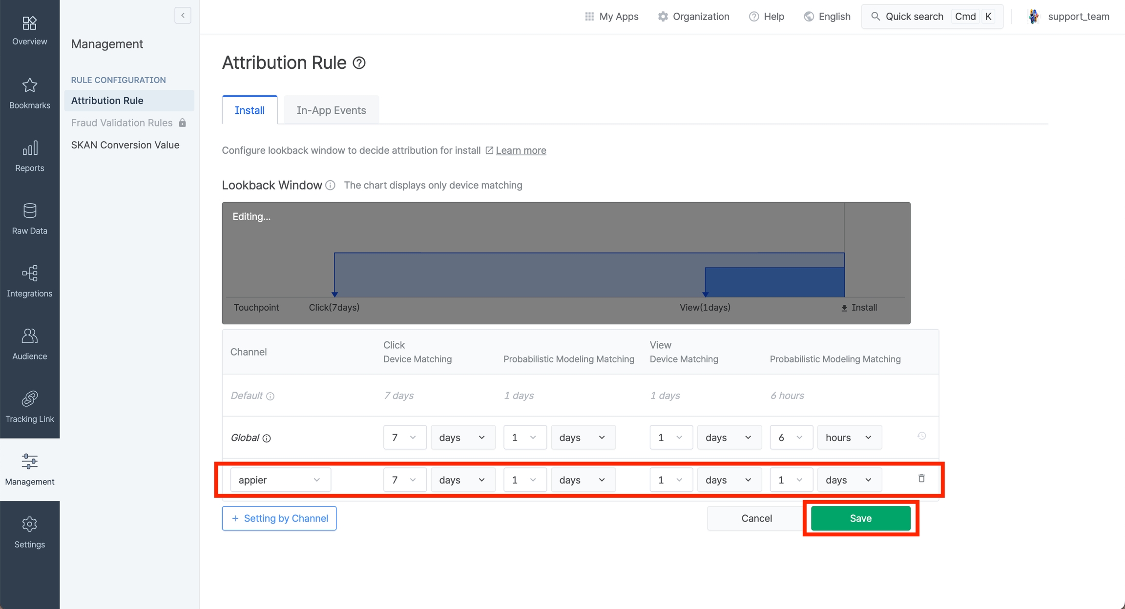 この変更を行った後は、アトリビューションの結果に関係なく、選択したイベントがこのチャネルに送り返されます。このデータはキャンペーンの最適化に使用されます。