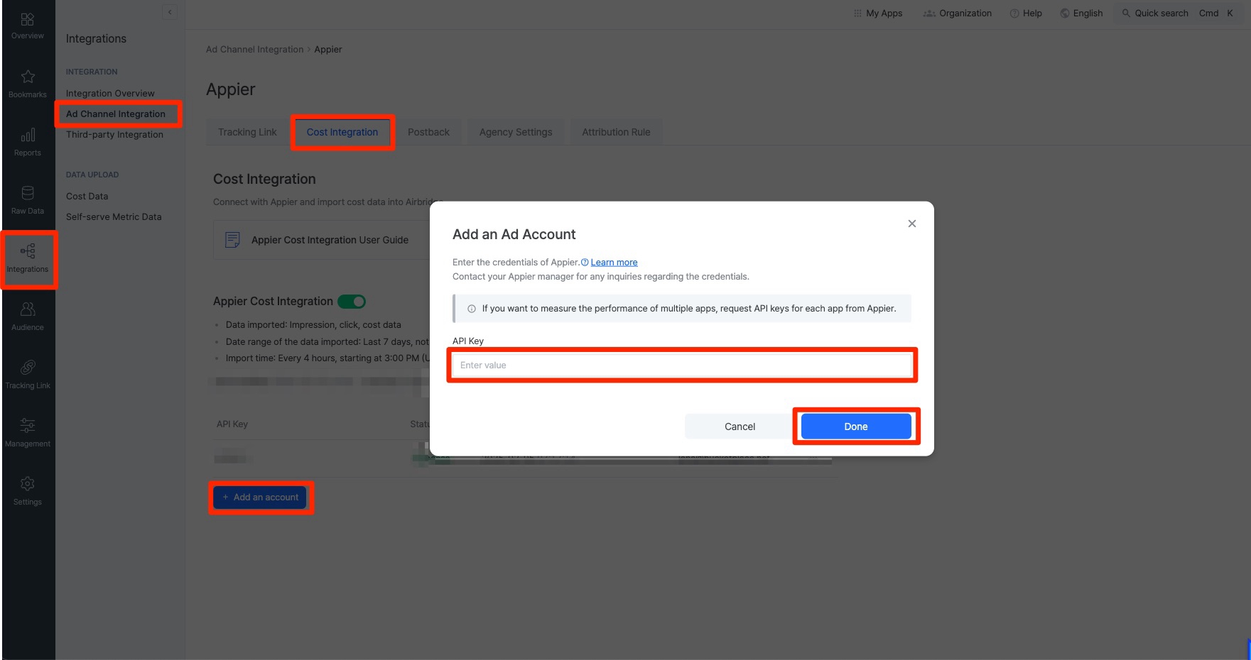 「Appier コスト統合」トグルを有効にします。