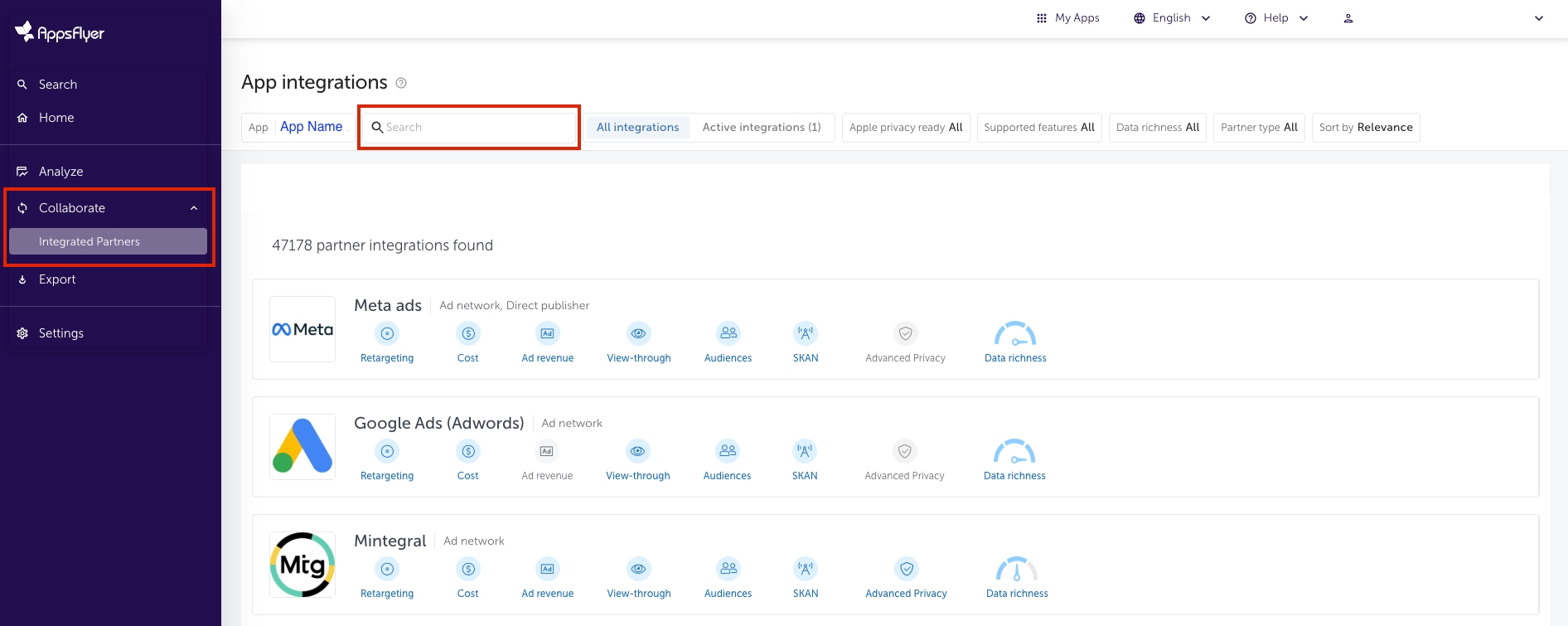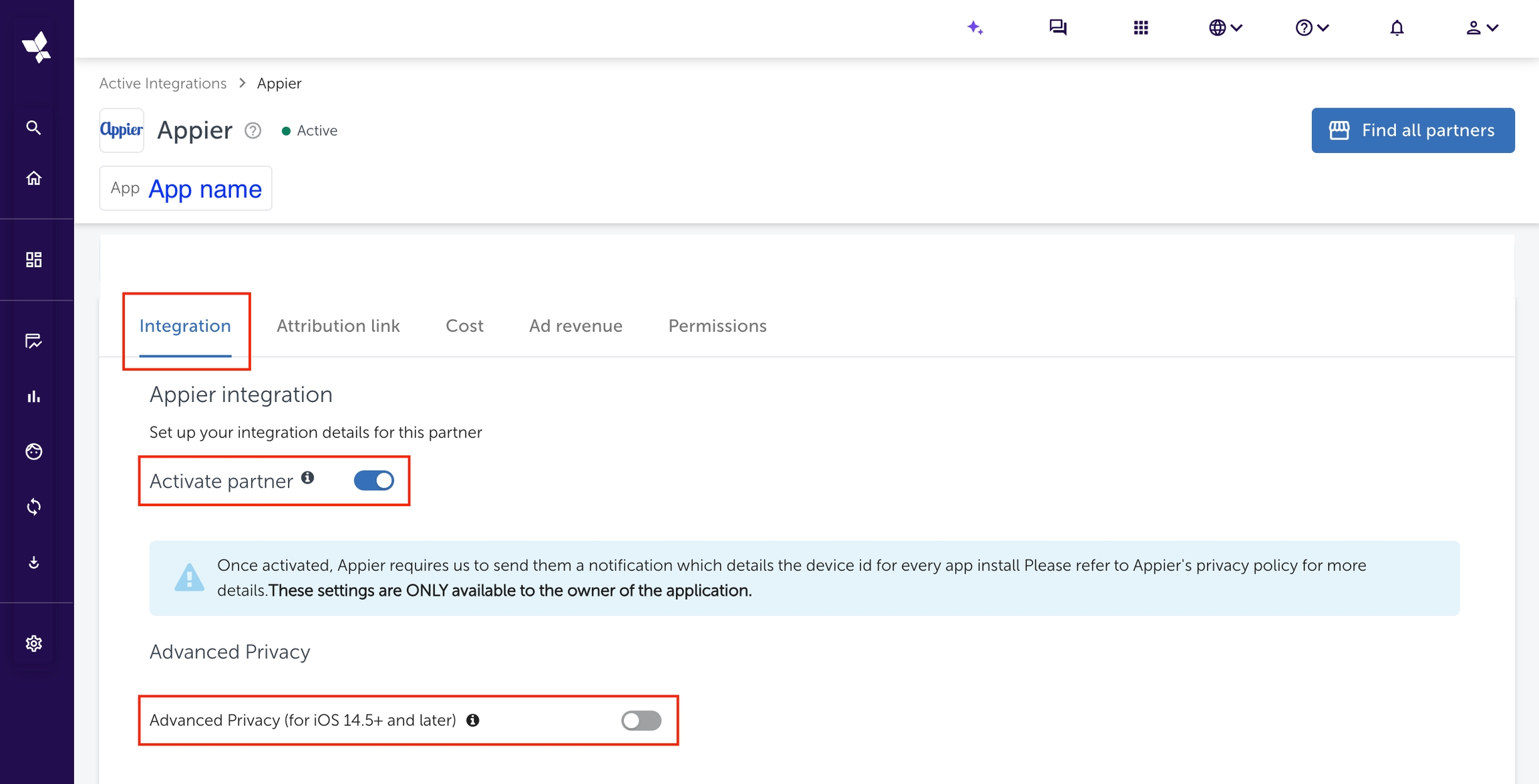 ナビゲーションサイドバーの「統合パートナー」をクリックします。