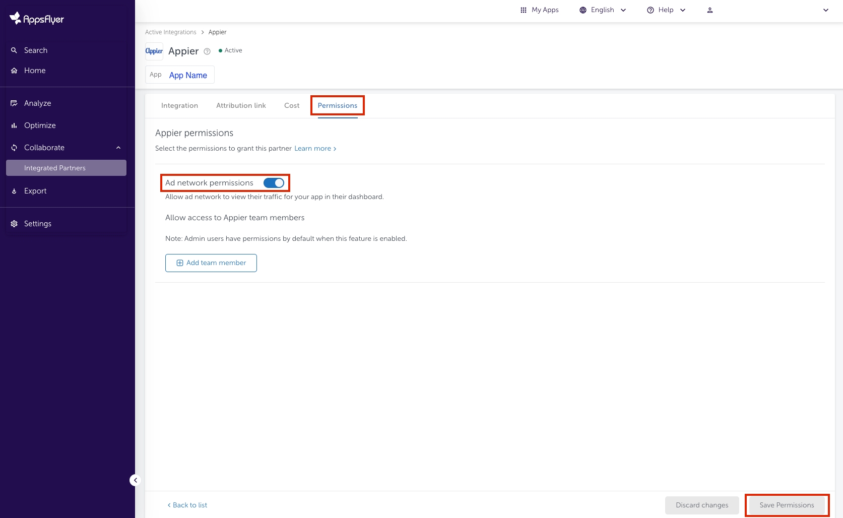 下記の権限をAppierと共有してくだいさい。