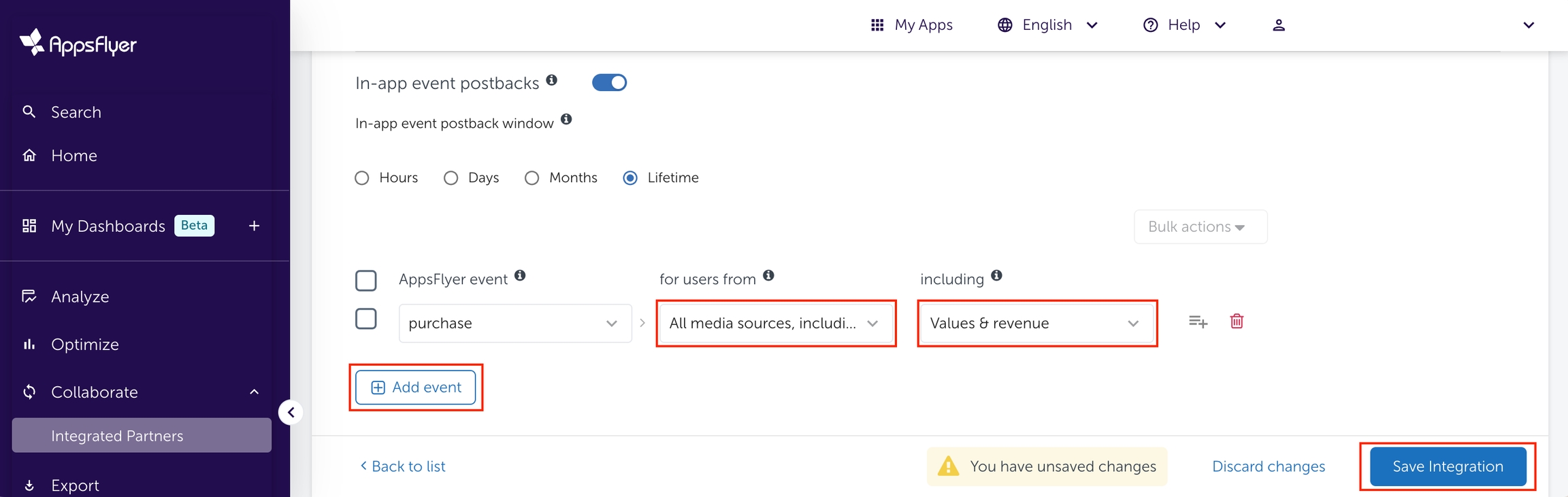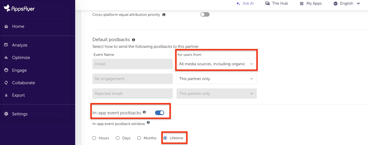 アプリ内イベントのポストバック期間で「Lifetime」を選択します。