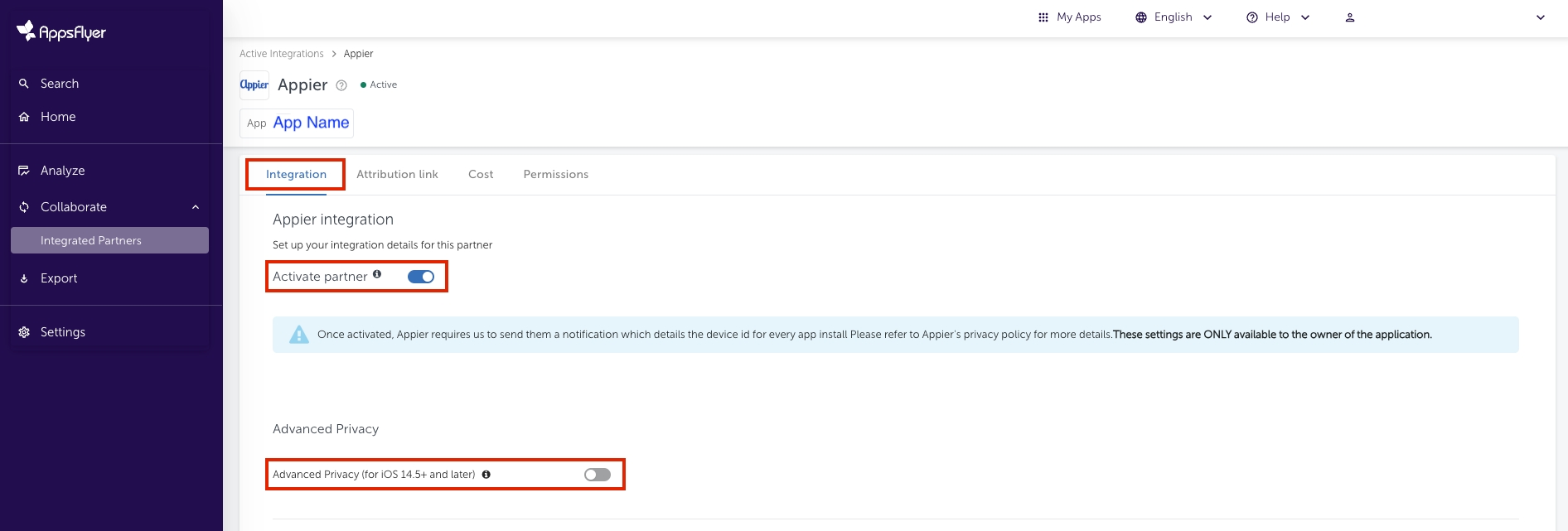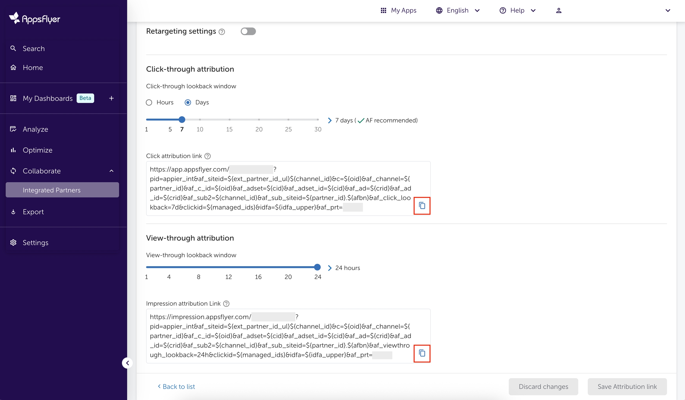 「コスト API」または「高プライバシー一括設定」モードを使用する場合、c、af_c_id、af_adset、af_adset_id、af_ad、およびaf_ad_id パラメータに特定の値を設定しないでください。