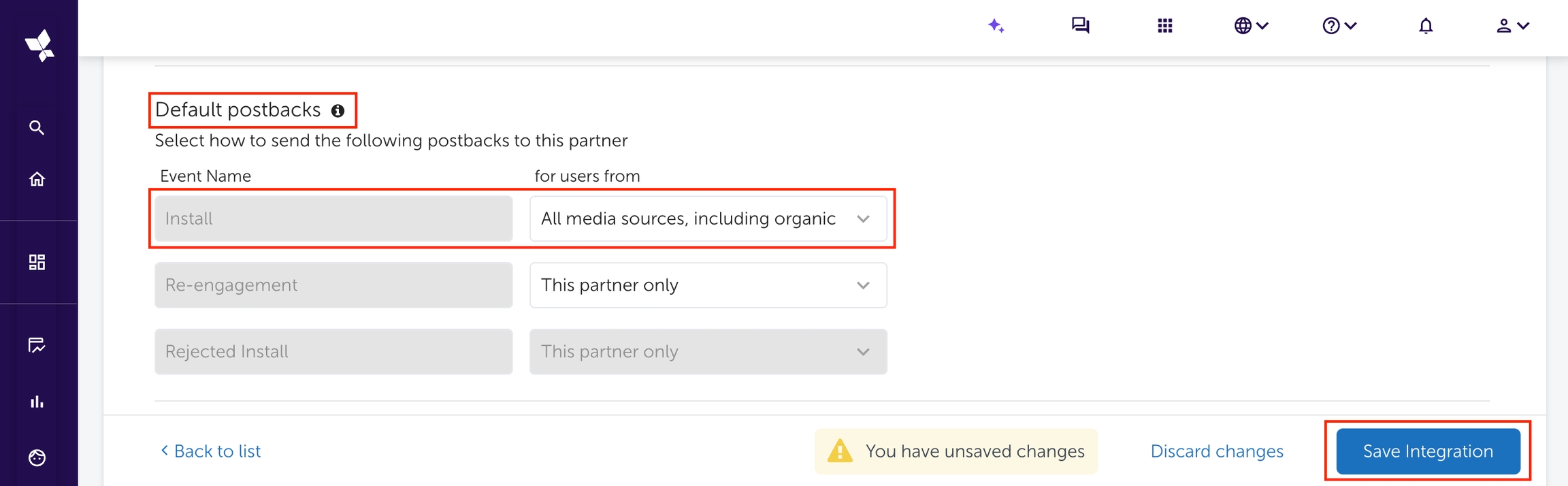 デフォルトのポストバックセクションまで下にスクロールし、インストールの「送信オプション」を「オーガニックを含む、全メディアソース」に変更します。