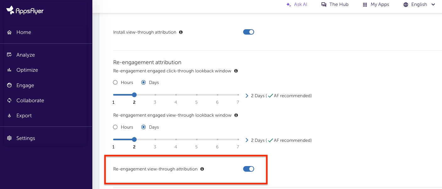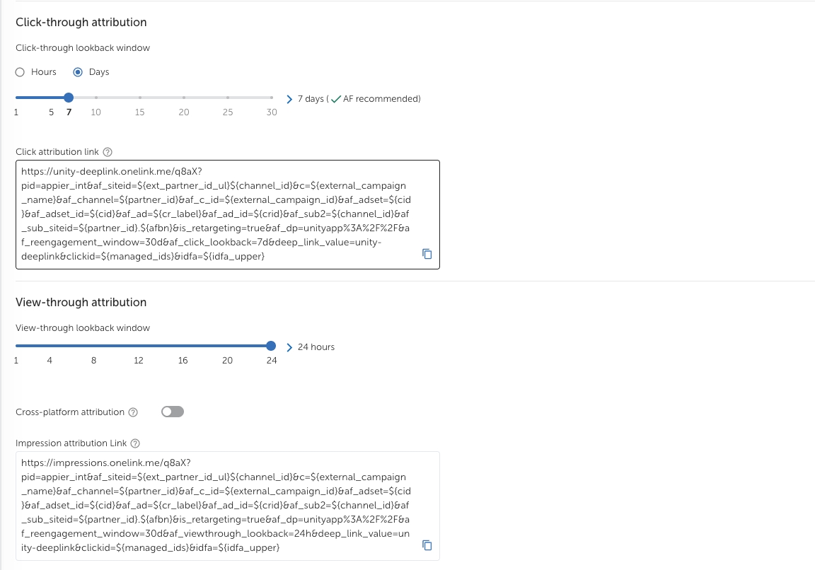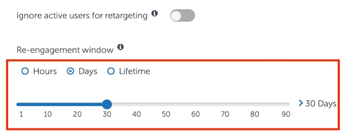 「リエンゲージメントウィンドウ」を決めてください。(リエンゲージメントウィンドウ:Appierにアトリビュートした「re-open, re-install」後イベントがAppierにポストバックする期間。)