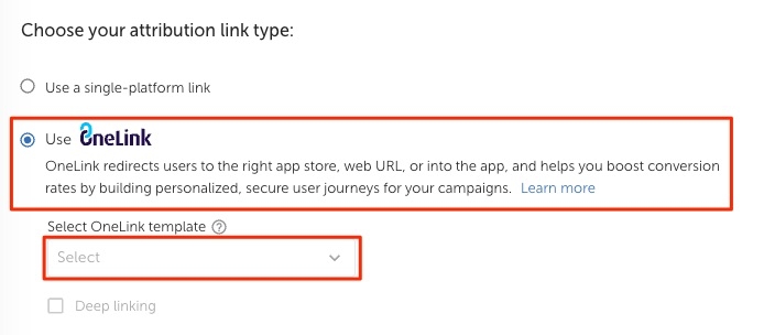 「OneLink を使用する」を選択し、OneLink テンプレートを選択します。以下のリンクのガイドに従って、OneLink テンプレートを設定してください: https://support.appsflyer.com/hc/en-us/articles/207032246-OneLink-templates