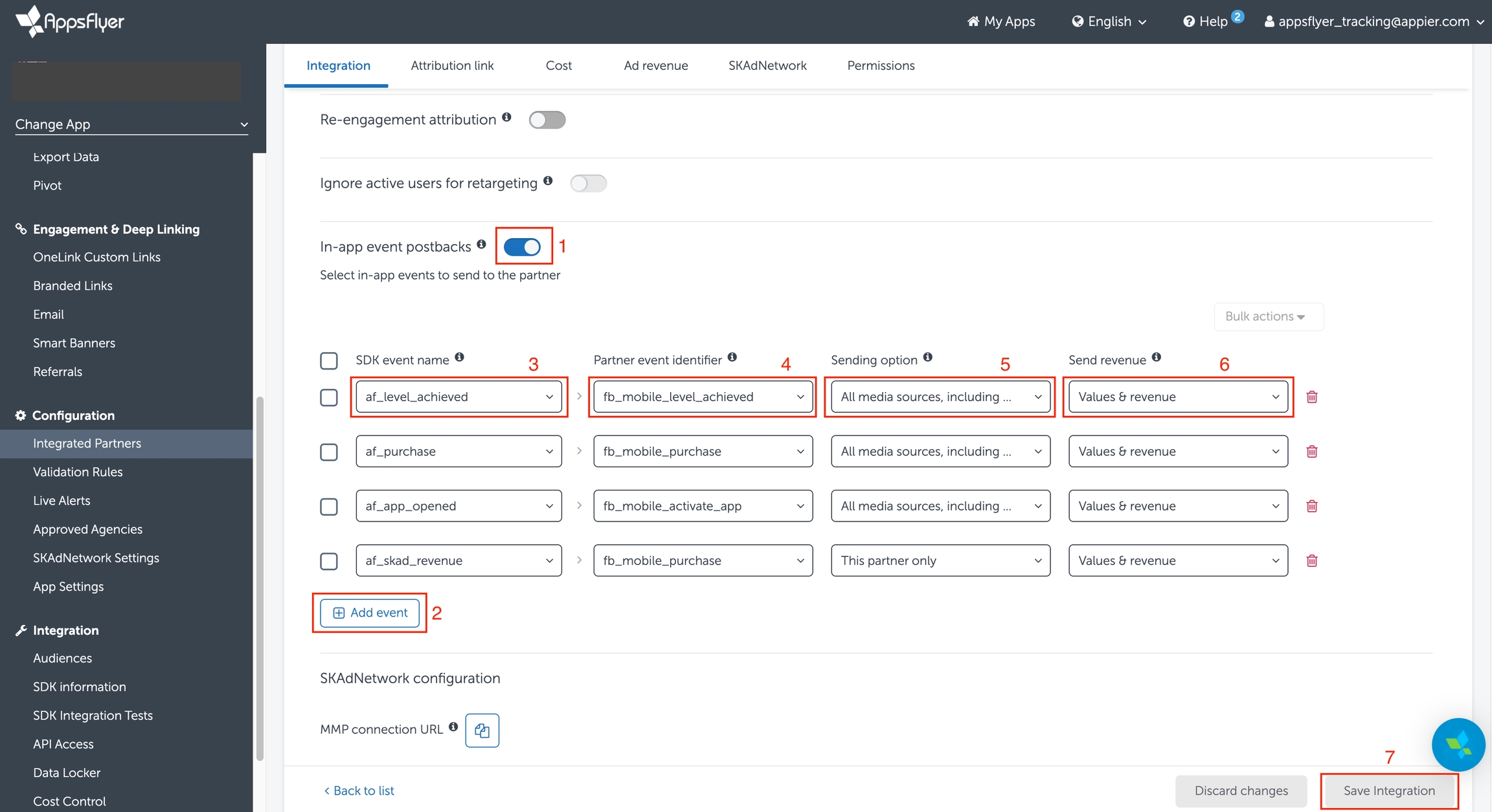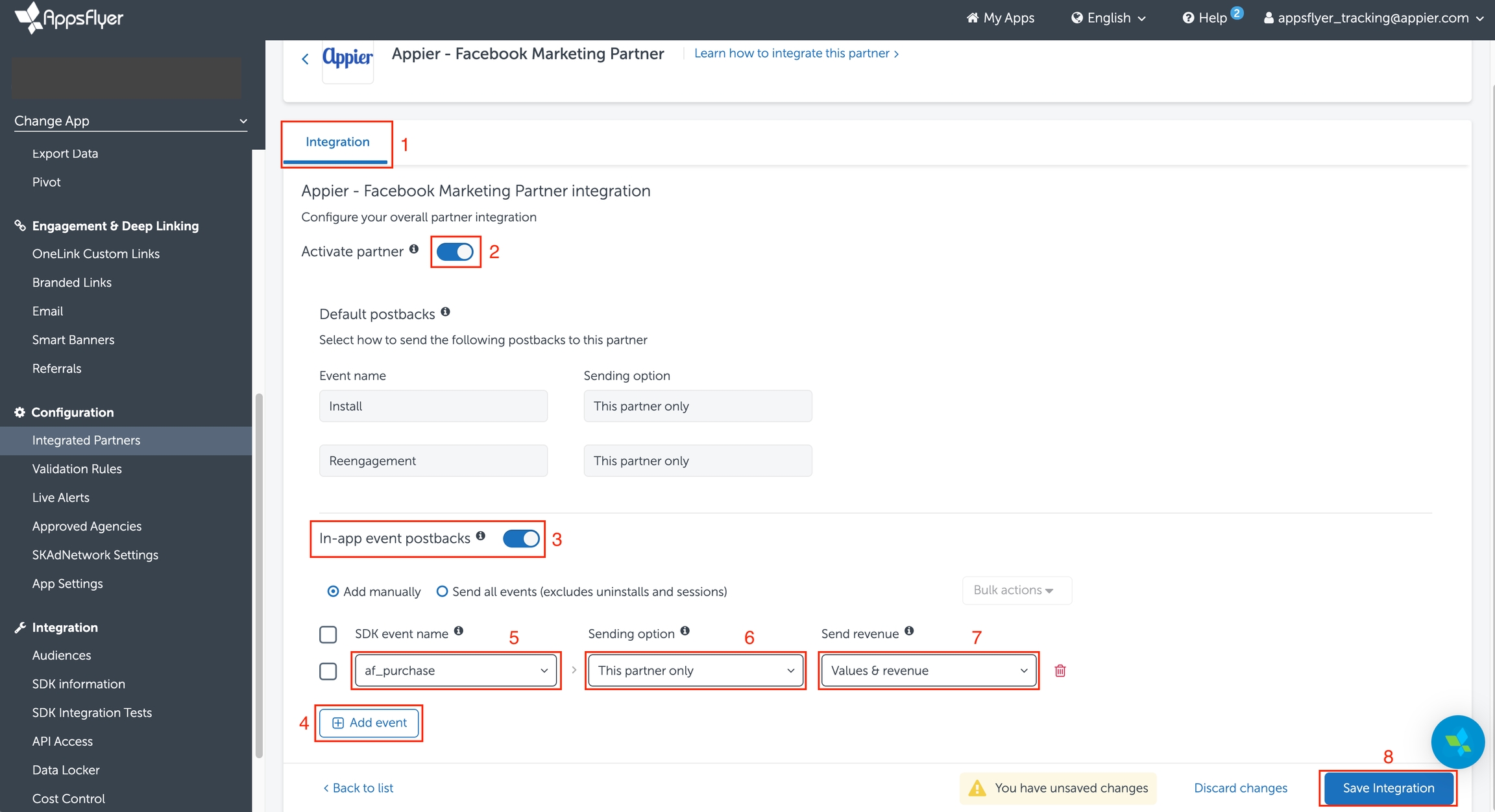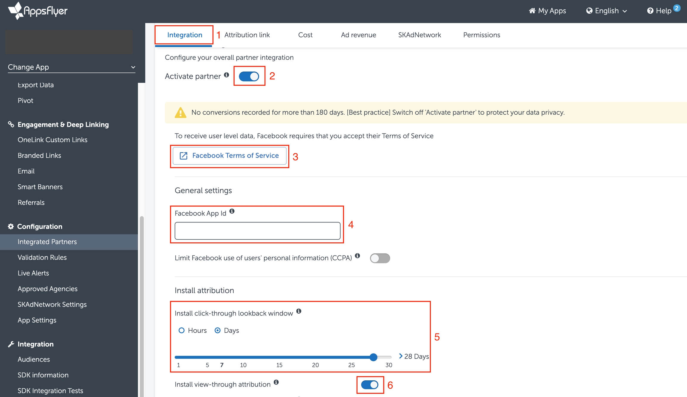 「連携」を選択します。 30. Turn ON "Activate partner". 31. Turn ON "In-app event postbacks". 32. Choose "Add event". 33. Select the same events that you passed to Facebook in step 21. 34. For each event, select "This partner only". 35. For the KPI event, if the KPI is optimizing for ROAS, select "Values & revenue". 36. Save Integration.