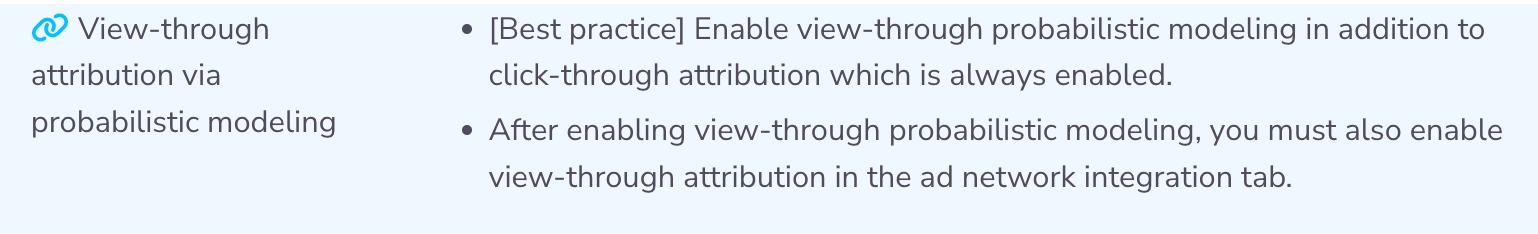 Appsflyer ガイドラインにおいても、広告主に対し、確率論的モデリングでのビュースルー計測の有効化が推奨されています。
