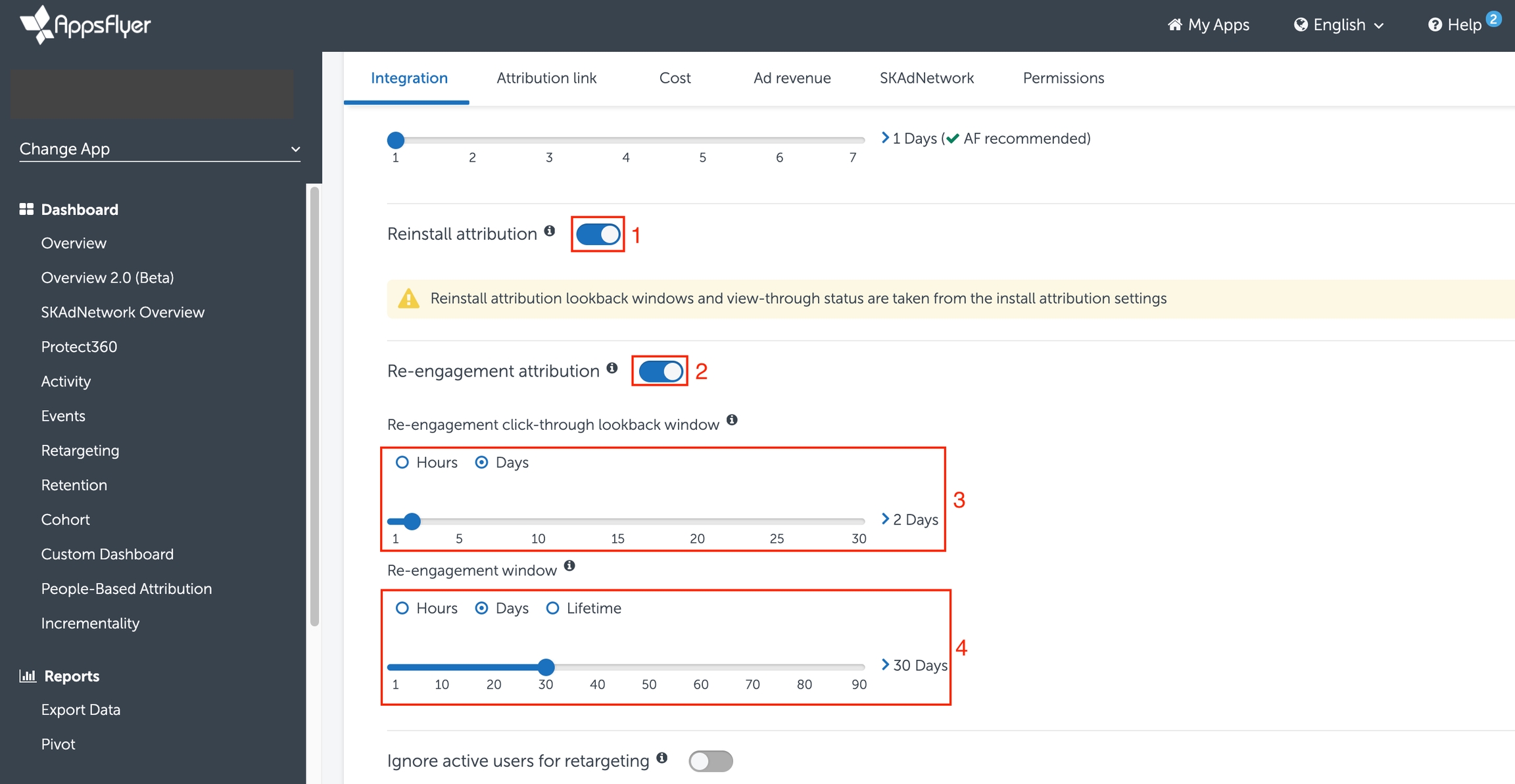[リターゲティングアトリビューションを有効にする]をオンにします。