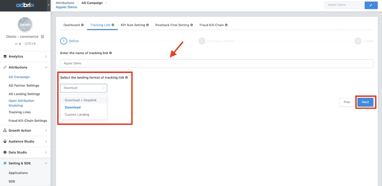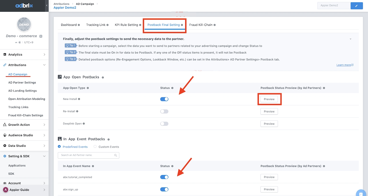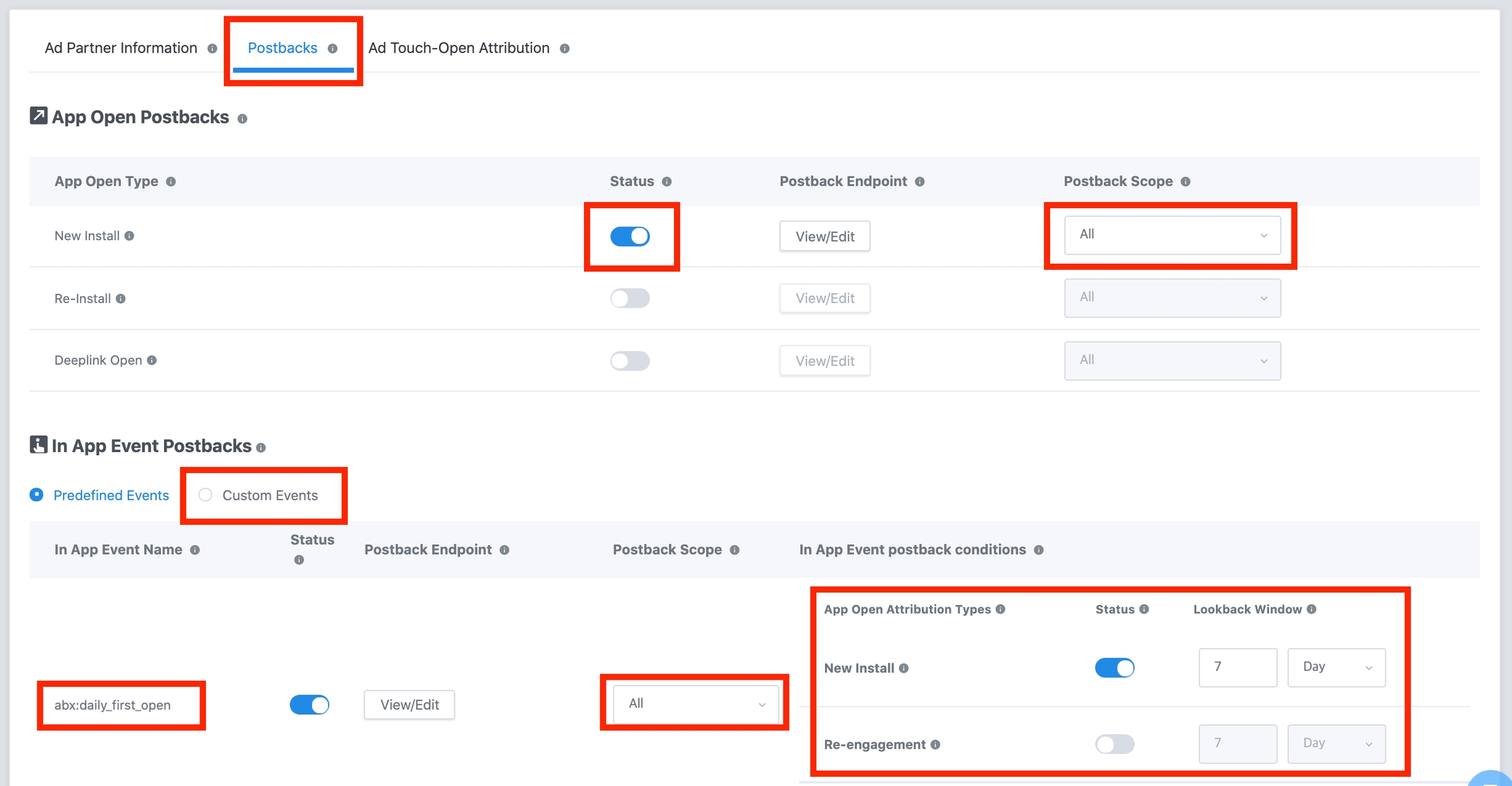 Set "App Open Attribution Types", "Status" and "Lookback Windows"