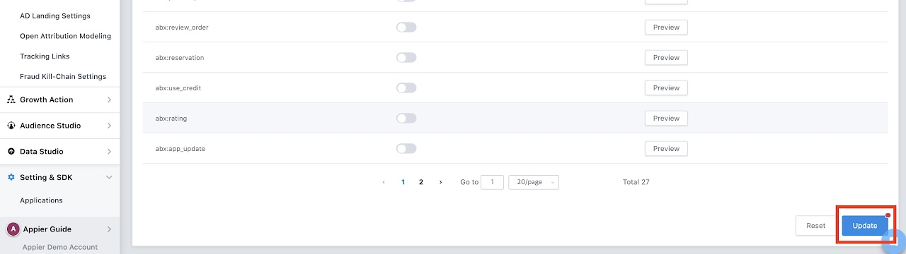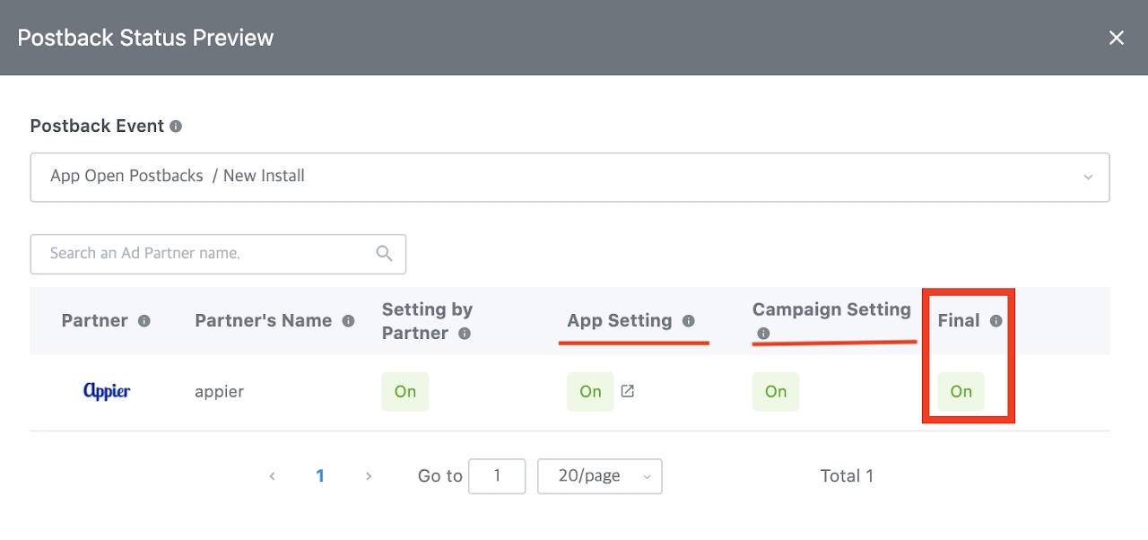 Check the final status is the green light; if the final status is off please check those two statuses: "App Setting" and "Campaign Setting". "App Setting" OFF: Please check steps 20~32. "Campaign Setting" OFF: Please check steps 25~28.