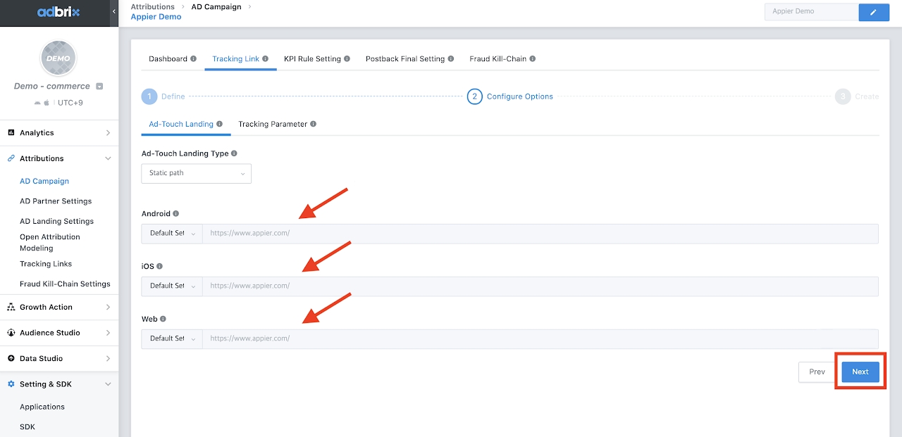 Check the landing URL "Default Settings": The link would be the same as set in "AD Landing Settings" 「カスタム設定」:リンクはここでカスタマイズできます (The link in the picture is just an example)