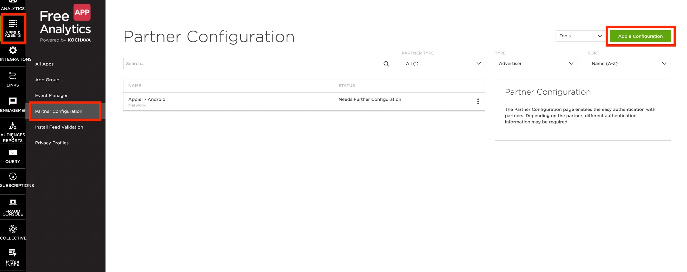 Go to "APP & ASSETS" > "Partner Configuration" and click "Add a Configuration".