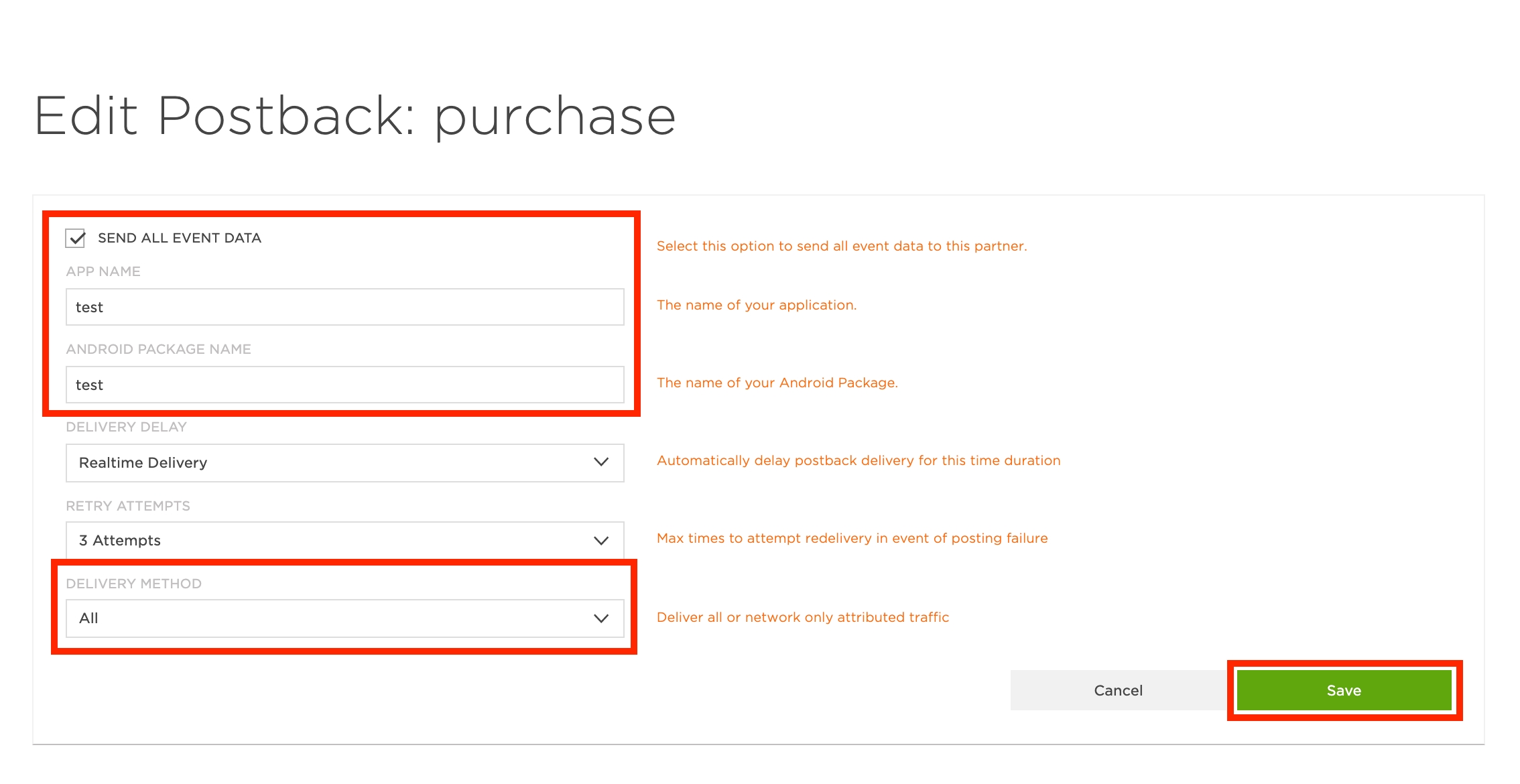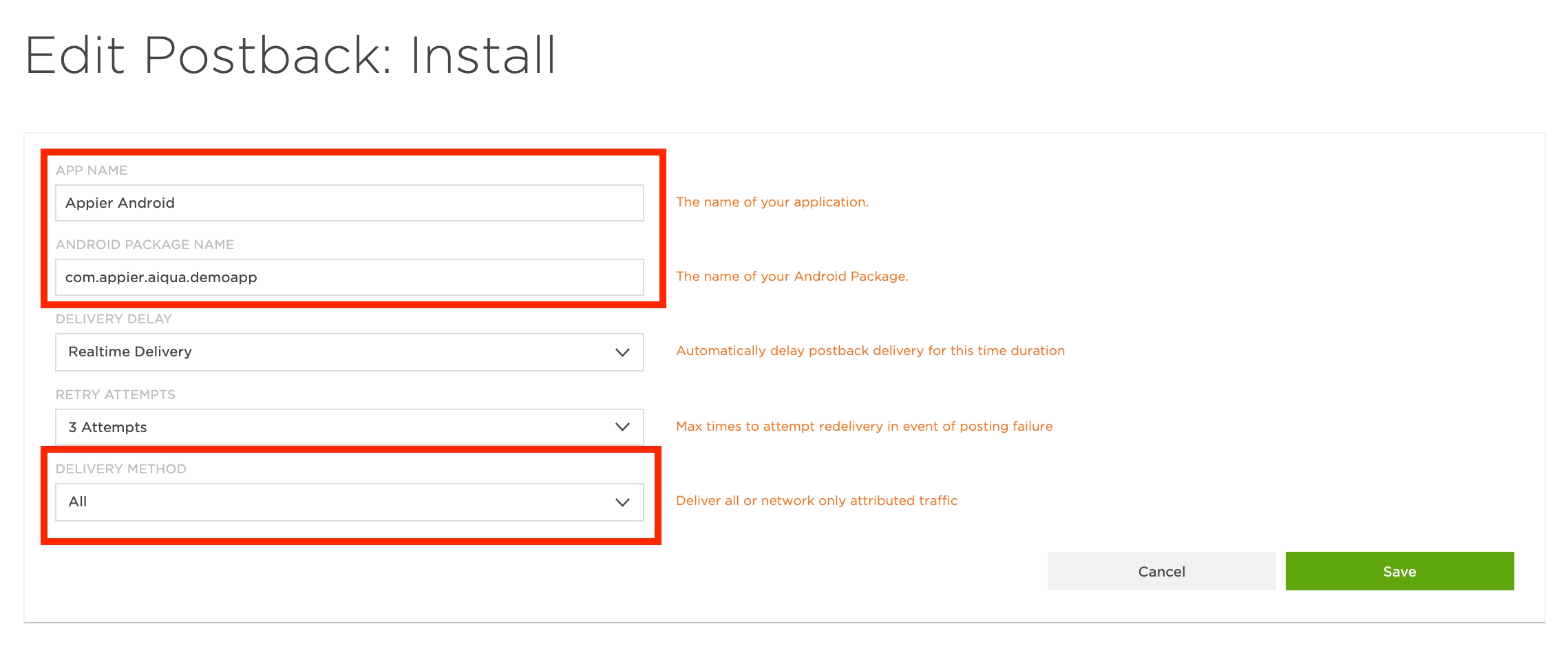 Select "All" as the "DELIVERY METHOD" in order to share all postbacks (attributed and non-attributed) to Appier. This is required for Programmatic DSP (AiBid) campaigns, and optional for other "CPI" campaigns.