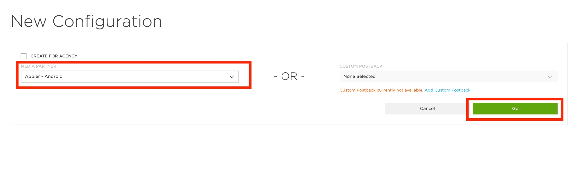 If your campaign is targeting Android, choose "Appier - Android" as the Media Partner and click "Go". If the campaign is targeting iOS, then choose "Appier - iOS".