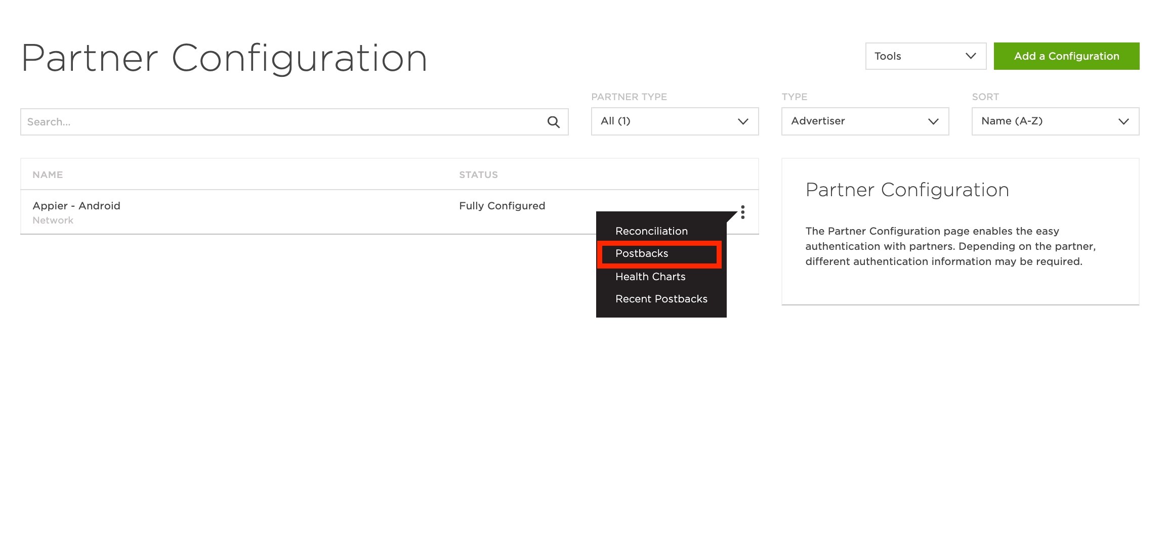 On the Partner Configuration page, click the menu on the right and select "Postbacks".