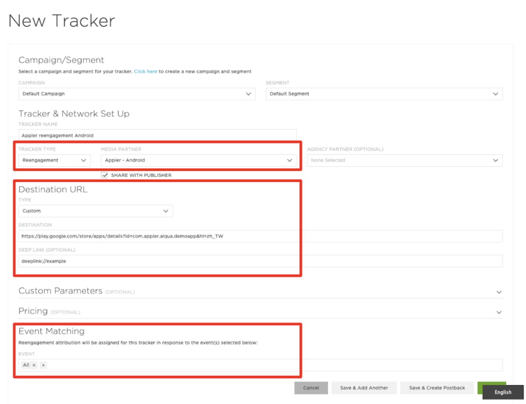 For the "TRACKER TYPE" field, choose "Reengagement". For the "MEDIA PARTNER" field, if your campaign is targeting Android, choose "Appier - Android". If your campaign is targeting iOS, then choose "Appier- iOS".