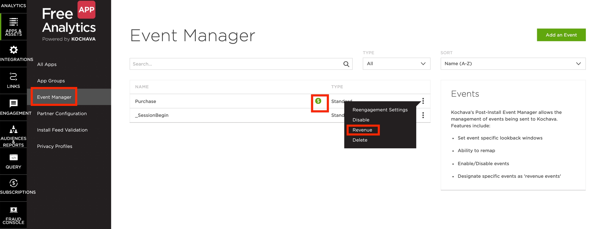 Go to "Event Manager" menu. For each purchase-related event, make sure that a money icon is displayed for that event. If this icon is not showing, please click the menu button on the right and click "Revenue" to turn it on.