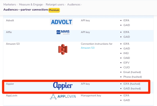 AppsFlyer Audience is a tool for AppsFlyer clients, which allows the creation of user segments and automates the transfer to partners such as Appier.