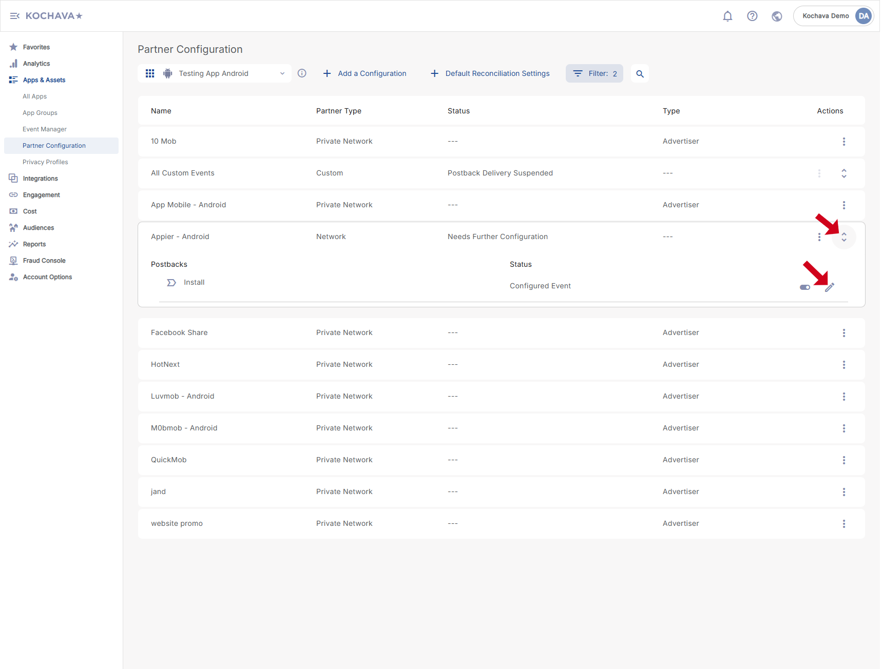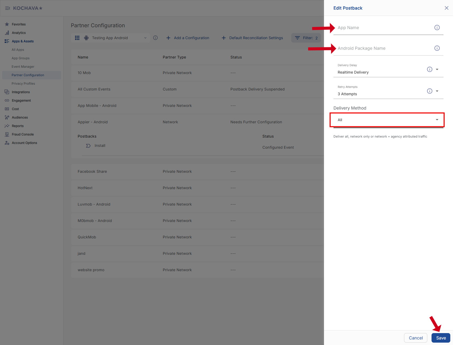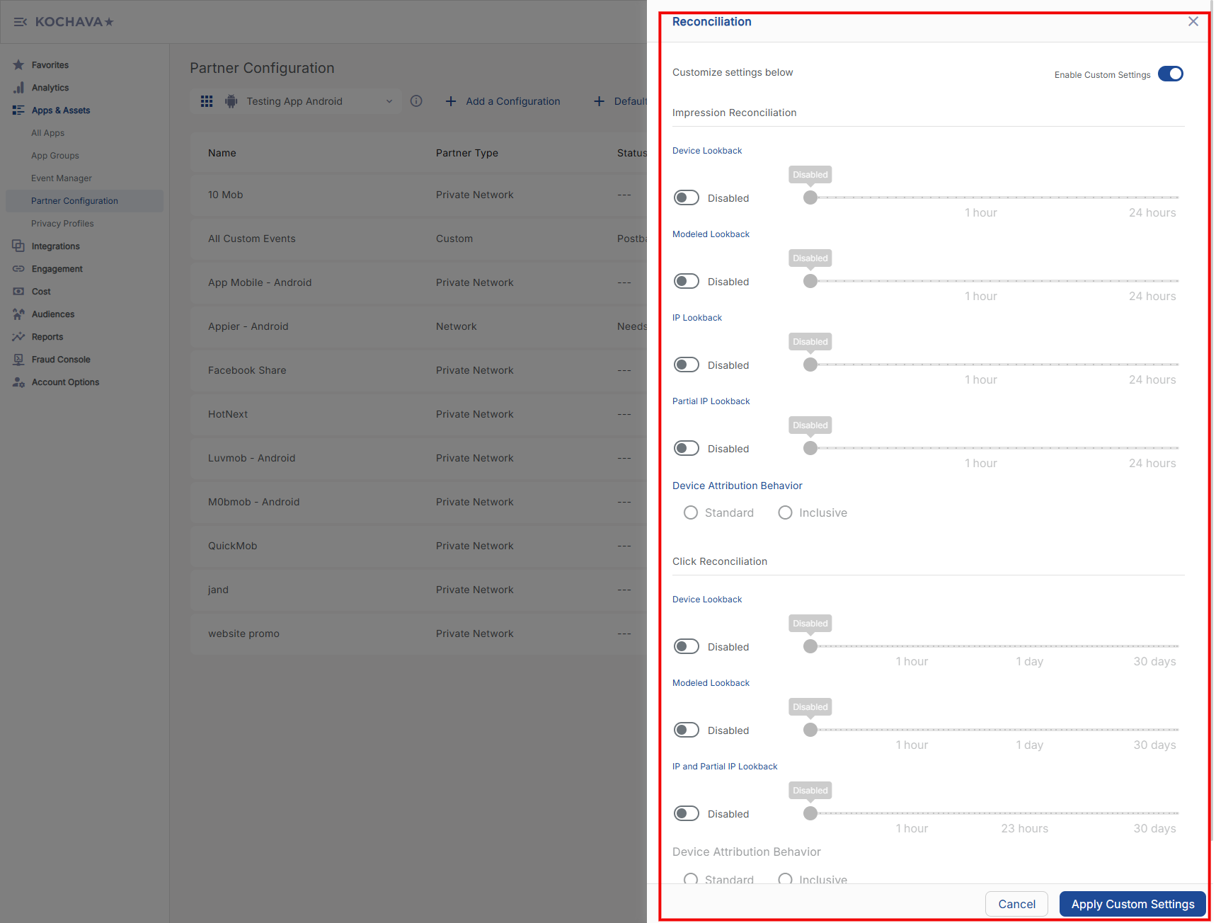 Before proceeding, please set up and enable your corresponding privacy profiles. Please be sure to have ATT opt-out profile (for iOS only) and probabilistic matching settings profile (Android and iOS separately). Privacy profile documentation available here https://support.kochava.com/create-manage-apps/creating-and-editing-privacy-profiles/