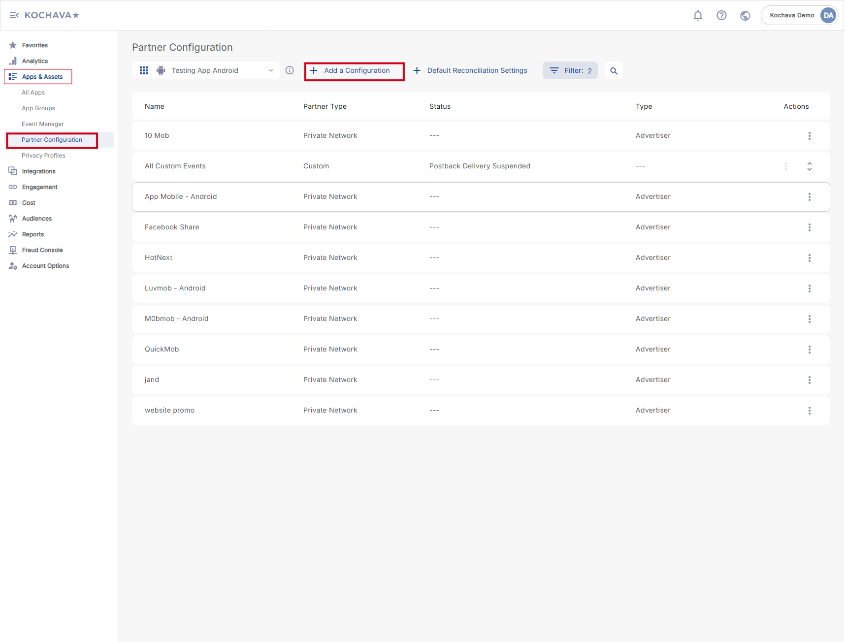 Go to "APP & ASSETS" > "Partner Configuration" and click "Add a Configuration".