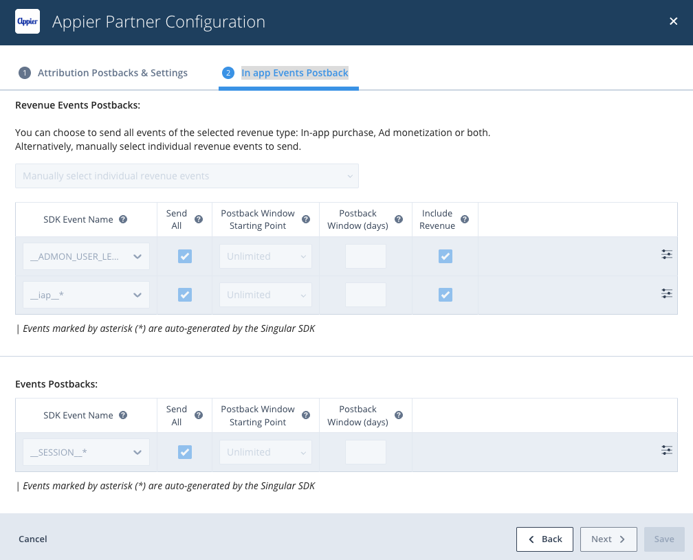 4.1. Choose the corresponding app and site 4.2. Select the first tab - Attribution Postbacks & Settings 4.3. Check all check boxes under Send Appier the following postbacks, like you see on the screenshot below: 4.4. Configure Attribution Windows Settings according to your needs, examples below: 5.1 Select the second tab - In App Events Postback 5.2 Please add all events which will be sent to Appier 5.3 For Revenue events, please check the "Send revenue" box 5.4 Please make sure that Send All is checked for all events you will be passing to Appier 5.5 Please make sure that Postback Window Starting Point is set to Unlimited